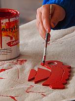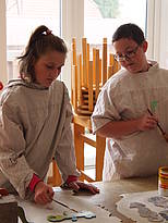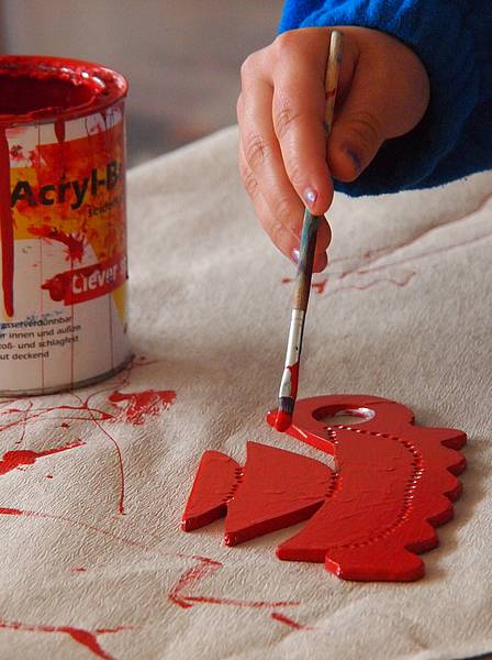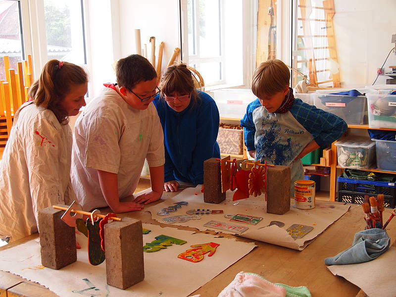 Herr Friede übernahm die Aufgabe, die zeichnerischen Entwürfe mit einer Metallsäge herauszuarbeiten und so jeder Metallplatte eine individuelle Form zu geben. Anschließend erläuterte er mit Schülerinnen und Schülern aller Klassenstufen ihre nächste Aufgabe: Mittels Bohrer, Körner und Hammer wurde den zugesägten Metallplatten Kontur und den Zeichnungen darauf Tiefe verliehen. Nachdem diese kraftaufwendigen Arbeiten abgeschlossen waren, wurden die kleinen Kunstwerke mit diversen Lacken farblich gestaltet.