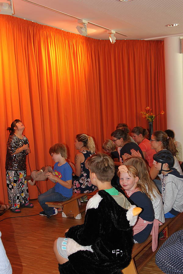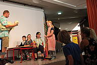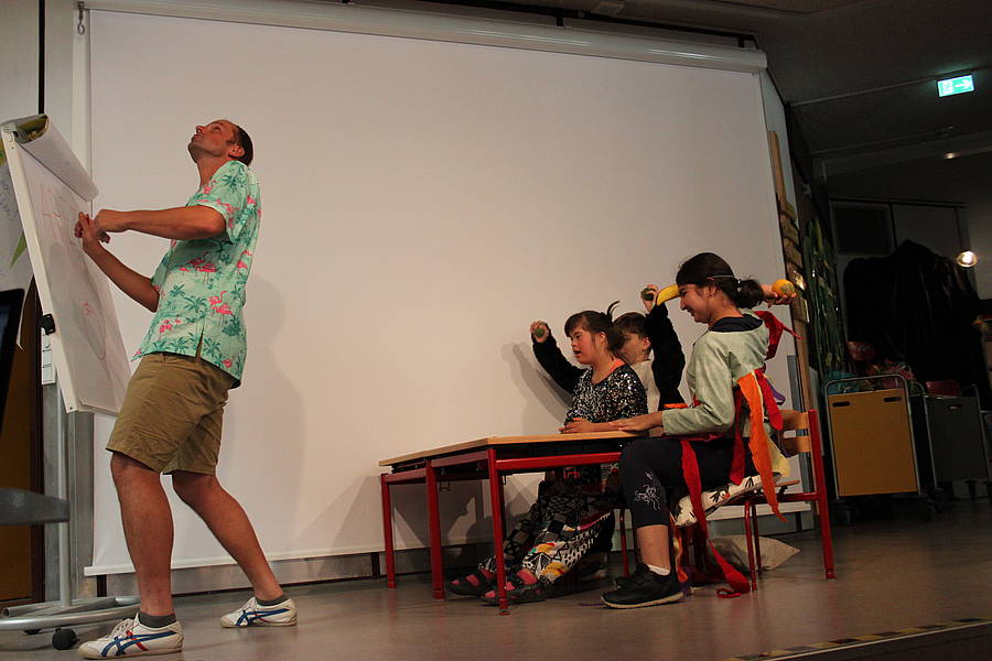 Die Theater-AG und die Känguruklasse habe ein kleines Theaterstück aufgeführt: Schule mit Professor Tibatong auf der Insel Titiwu und Schule mit der Känguruklasse. Bei der Schulszene von „Urmel aus dem Eis“ ging es ziemlich verrückt zu: Äpfel flogen durch das Klassenzimmer und plötzlich klopfte „Wutz“, das Putzschwein, an die Tür. Es war Montag, und Wutz wollte putzen.