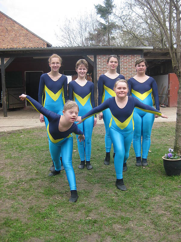 Im 2. Halbjahr war dann unsere Turniergruppe mit Mareike, Steffi, Svenja, Annalena, Marie, Jennyca und Kevin dran. Diese Gruppe ist schon vertrauter im Umgang mit dem Pferd und turnt teilweise auch schon im Galopp die verschiedenen Voltigierübungen wie “Fahne, Mühle, Schere, Leuchtturm, Karussell……” Die Sieben voltigieren inzwischen auch schon auf dem Großpferd “Henri”. Im April sind sie in Lüchow beimTurnier des Reiterverbandes Hannover/ Bremen erfolgreich gestartet und dürfen im Juni an den National Games der Special Olympics in Bremen teilnehmen. Hier kann man sie in ihren Voltianzügen sehen: