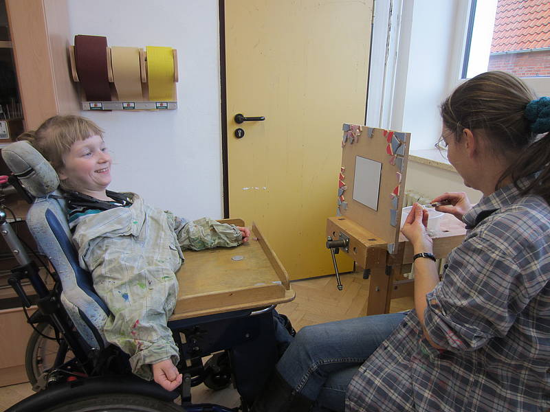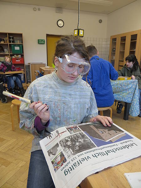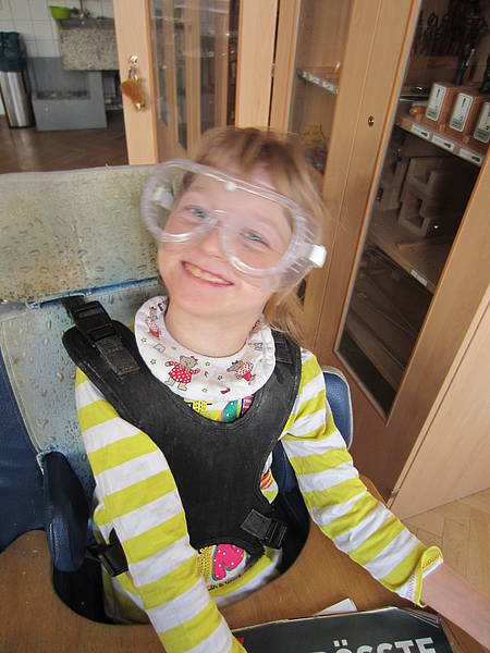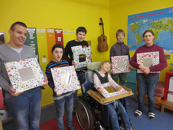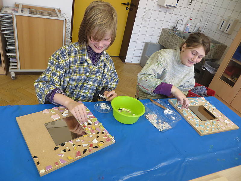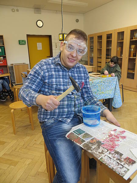 Aus einem großen Fundus bunter Fliesen suchten sich die Schüler ihre Lieblingsfarben heraus. Bewaffnet mit Hammer und Schutzbrille wurden die Fliesen dann im Werkraum, mit viel Spaß, zerkleinert.
