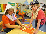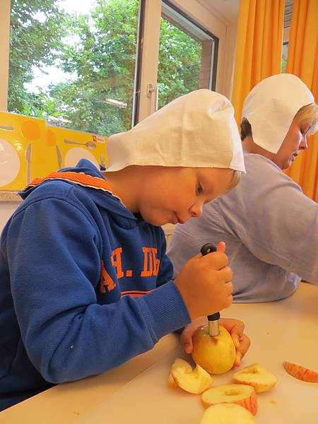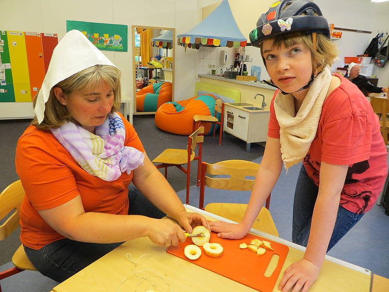 Zu den „Bauern und Bäuerinnen im Mittelalter“ gehörten Aaliyah aus der Bärenklasse, Alicia, Till und Kotaro aus der Igelklasse, Louis aus der Mäuseklasse, Berk aus der Klasse Bou-Vinals sowie Beatrice aus der Klasse Rother. Unser „Kennzeichen“ war eine Mütze, wie sie von den Bauern im Mittelalter getragen und jeden Morgen zu Beginn unserer Arbeit verteilt wurde. In der Projektwoche beschäftigten wir uns vor allem mit dem Essen und Trinken der Bauern damals.