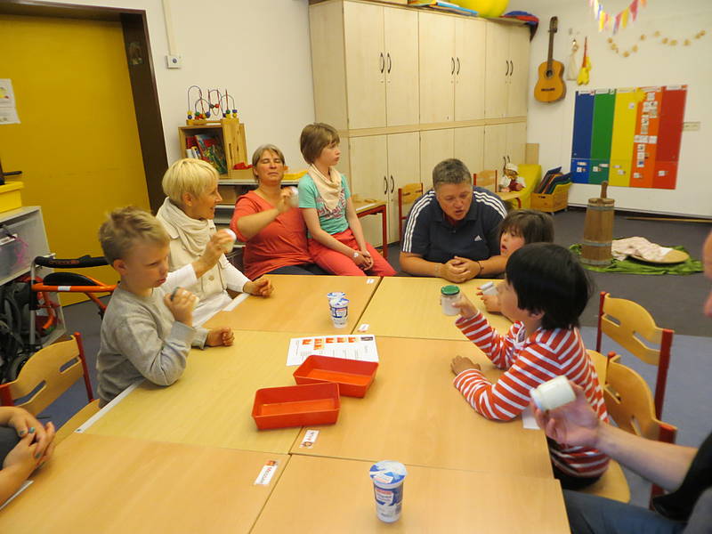Anschließend bekam jeder ein kleines Butter-„Gläschen“ und durfte selbst sein „Butterglück“ versuchen. In das Gläschen füllten wir ein wenig Sahne, dann schüttelten wir kräftig, kräftig und kräftig und – welch’ eine Überraschung“ – im Gläschen war ein Butterklumpen zu sehen!
