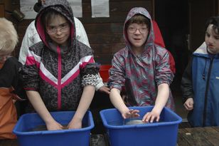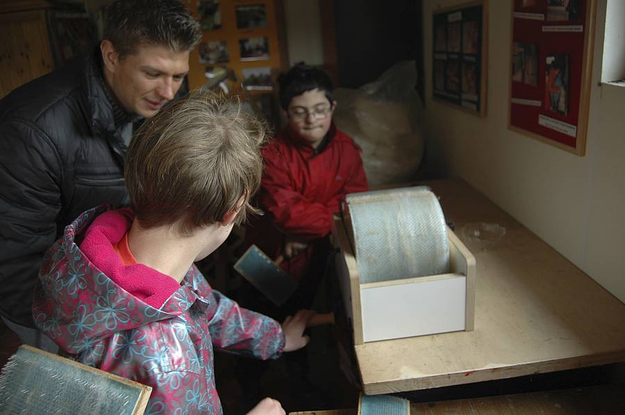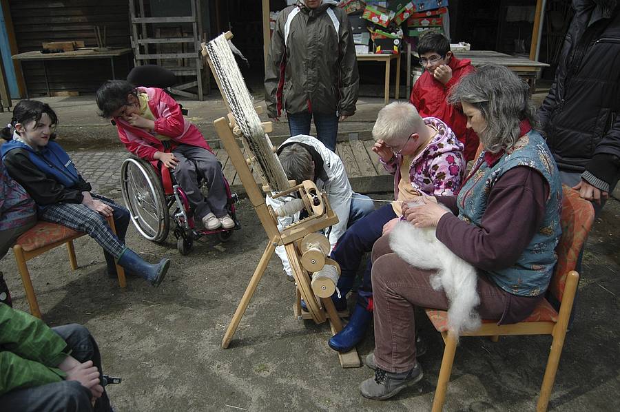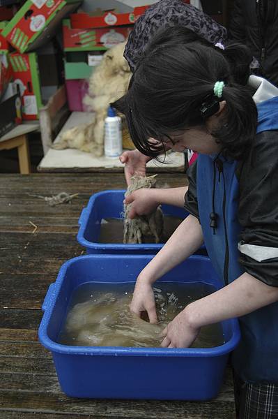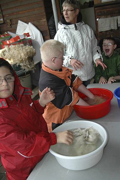Danach musste die Wolle gewaschen werden. Wenn sie vom Schaf geschoren wird, ist sie noch voller Stroh und Dreck. Das Waschwasser war schnell ganz schmutzig und musste immer wieder gewechselt werden.
