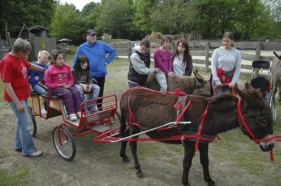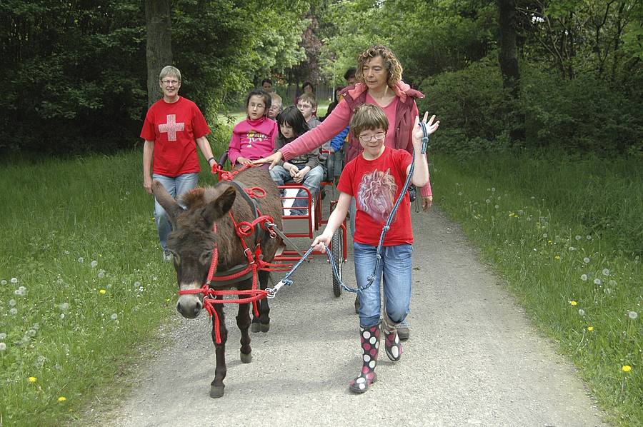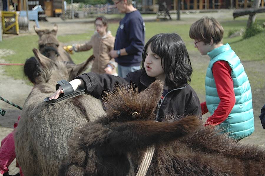 Dienstag wurden die Esel Hansi, Franzi und Fridolin gründlich geputzt. Dann wurde Franzi vor eine kleine Kutsche gespannt und wir haben einen Spaziergang durch den Park gemacht. Vier Kinder durften in der Kutsche sitzen, ein Kind musste Franzi führen und ein anderes Kind durfte auf Hansi reiten. Zwischendurch wurde gewechselt. Nur Fridolin durfte einfach nur spazieren gehen ohne jemanden zu tragen oder zu ziehen.