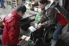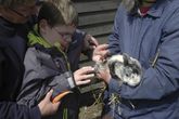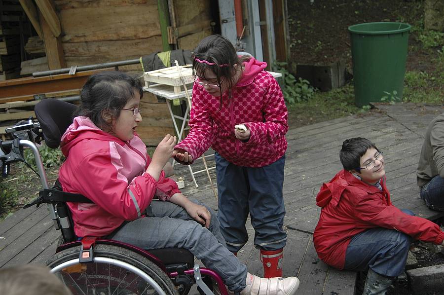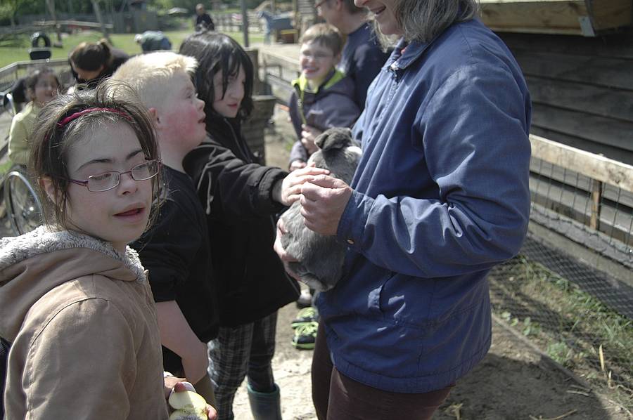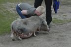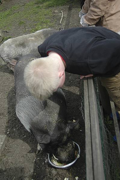 Dann musste das Essen für die Schweine Lotti und Loui in Schalen gefüllt werden. Schweine essen ganz unterschiedliche Dinge: Brot, Bananen, Äpfel, Gurken, Tomaten, Möhren, Salat, Kartoffeln – wie die Menschen also, nur dass Obst, Gemüse und Brot schon etwas älter waren und die Kartoffeln nicht gekocht werden mussten. Weil Loui Lotti immer die besten Stücke aus dem Napf klaut, mussten die beiden getrennt von einander essen... Wenn Lotti aufgegessen hatte, konnte man sie sogar streicheln.