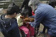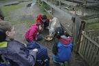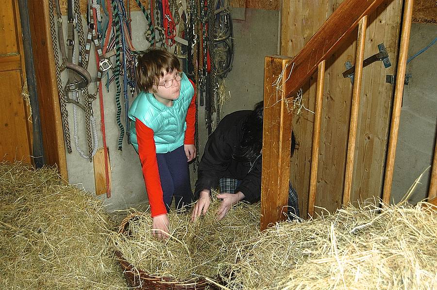 Als erstes mussten die Tiere gefüttert werden. Zwei Kinder sind auf den Heuboden geklettert – dabei musste man aufpassen, nicht die Hühner zu stören, die ihr Nest auf den Treppenstufen gebaut hatten – und haben Heu runter geworfen, wo es von den anderen Kindern in Körbe gesammelt wurde.