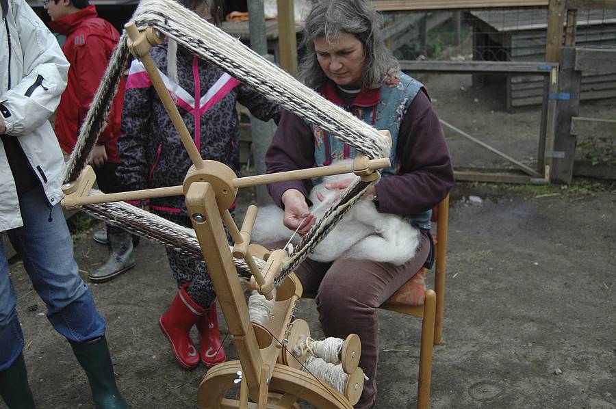 Schließlich hatten wir ein großes, weiches Vlies, das aussah wie der Bart vom Weihnachtsmann. Es ist gar nicht so leicht, dass Spinnrad mit dem Fuß anzutreiben!