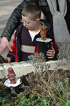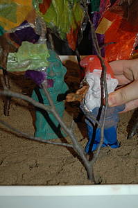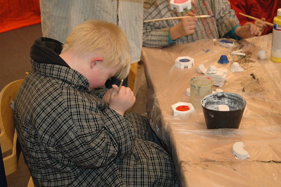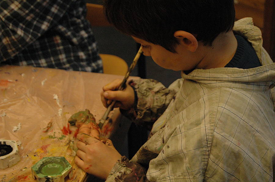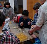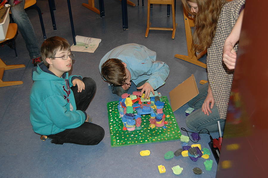Zuerst haben wir Gips in die Keksformen rein gemacht. Dann haben wir 2 bis 3 Wochen gewartet. Dann haben wir die Steine aus den Keksformen raus gemacht und haben die Steine angemalt. Wir haben eine Platte angemalt und die Steine auf die Platte rauf geklebt. Wir haben die Burg fertig gemacht. Vielleicht wollen wir Ritter auf die Burg stellen.