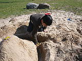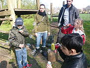 Viele Baumeister machten sich im Sandkasten an die Arbeit. Als das Werk beendet war, konnte man eine große Burg mit Burggraben und viele kleine Nebenburgen bewundern. Mit Apfelschorle und Kinderschokolade wurde das „Richtfest“ gefeiert!
