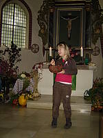 Den Gottesdienst vorbereitet hatten Mitarbeiterinnen und Mitarbeiter der Schule, doch in der Kirche hatten auch die Schülerinnen und Schüler einiges zu tun! Gemeinsam überlegten sie, was man ernten kann und was man zum Leben braucht. Mit Begeisterung zeigten sie verschiedene Gaben und brachten auch noch einige dazu vor den Altar. Das waren Obst, Gemüse und Brot zu sehen, aber auch Jeans, eine Jacke, eine Wasserflasche und symbolische Schilder für "Freundschaft" und "Liebe" wurden vor die Stufe des Altars gelegt. Für diese Dinge Gott zu danken, dazu wurde dieser Gottesdienst gefeiert. Das konnte mit Gebeten und Liedern geschehen. Schließlich wurden auch Weintrauben und Brot miteinander geteilt, als Zeichen dafür, dass Gott den Menschen geben möchte, was sie brauchen.