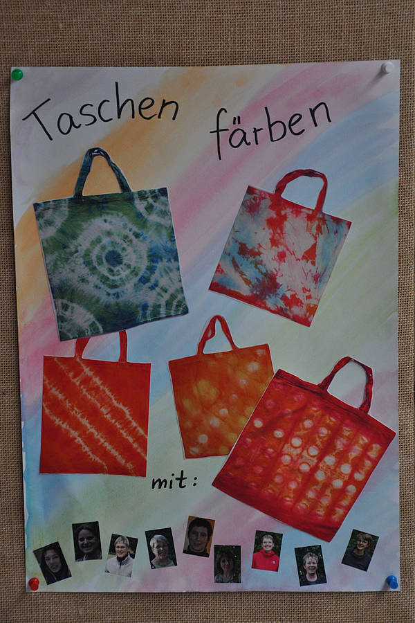 An einem Tag in der Woche durfte sich jeder Schüler eine Tasche mit der Batik-Technik farbig gestalten. Es wurde gewickelt und geknotet oder Schraubzwingen oder Klammern wurden an den Taschen befestigt. Nach dem Tauchbad in der Farbe wurde es jedes Mal spannend: Wie ist das Muster wohl geworden? Welche Farben sind dieses Mal entstanden? Jede Tasche ist einzigartig geworden.