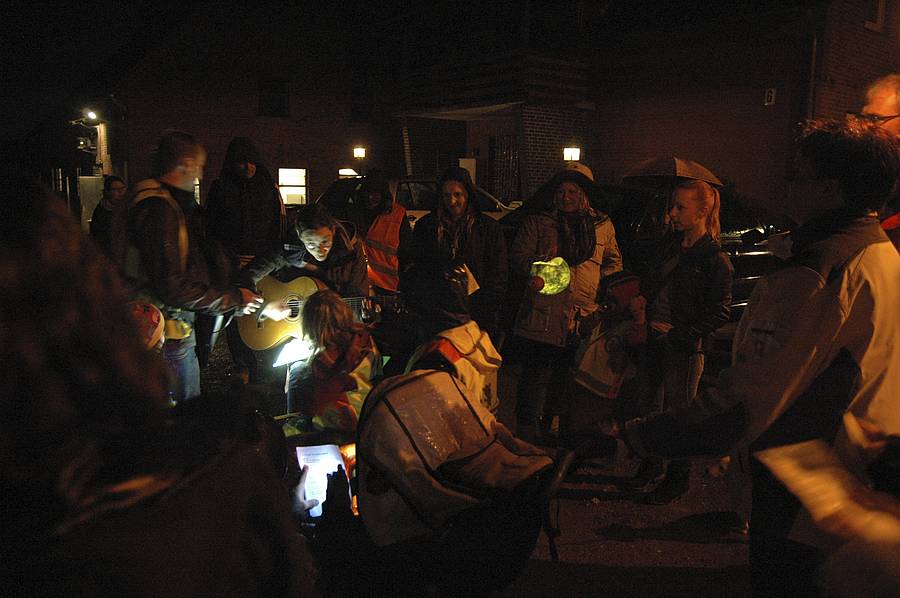 Gegen 17:00 Uhr haben sich dann alle wetterfest angezogen, um zum Laternenumzug aufzubrechen – denn vom Regen wollten wir uns doch nicht die Laune verderben lassen! Die Laternen leuchteten wieder wunderschön durch die Dunkelheit und alle Kinder und Erwachsenen haben kräftig bei den Laterneliedern mitgesungen.