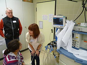 Danach sind wir in einen Untersuchungsraum gegangen. Simon hat sich als erster Patient freiwillig gemeldet und wir durften alle seinen Herzschlag durch das Stethoskop hören.
