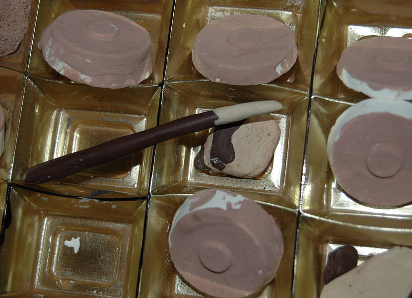 Als auf den Tischen bunte Schwämme, Fimo, Gießmasse und Fingerfarben ausgebreitet waren, wussten die Kinder der Löwenklasse noch nicht, was das mit den Fotos von der leckeren Schokolade und den leeren Schokoladenpackungen zu tun haben sollte. Machen wir etwa Schokolade? Echte Schokolade? Aber Schwämme schmecken doch gar nicht! Nein, die schmecken überhaupt nicht, aber man kann täuschend echte Scherz-Schokolade daraus herstellen.