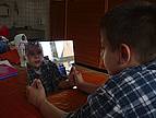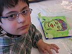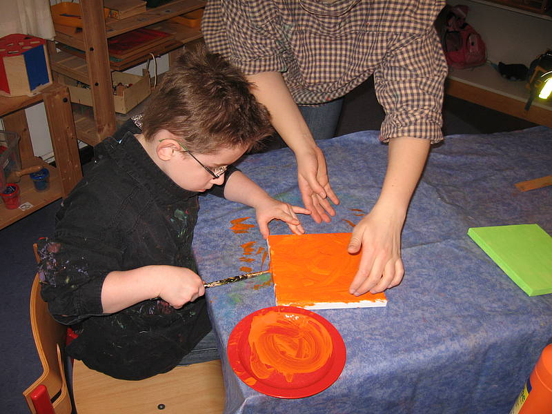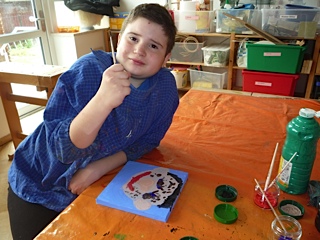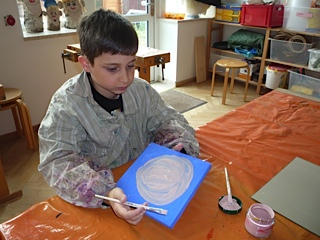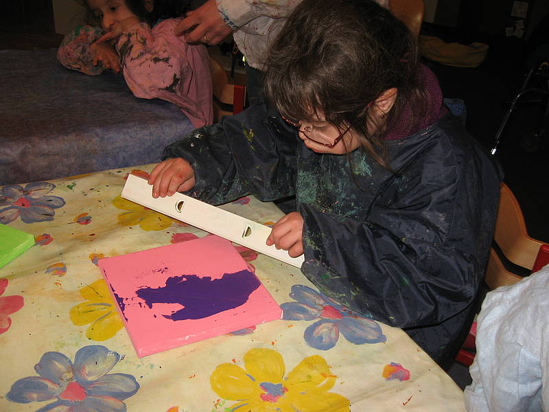 Die Kinder aus der Mäuseklasse und der Igelklasse haben die Leinwände ganz nach ihrem Geschmack gestaltet – die Technik mit den Linealen haben sie sich bei dem Maler Gerhard Richter abgeguckt. Nach einiger Übung auf Papier haben sie ihr Gesicht mit Hilfe einer (von den Erwachsenen gefertigten) Schablone auf die Leinwand gebracht.