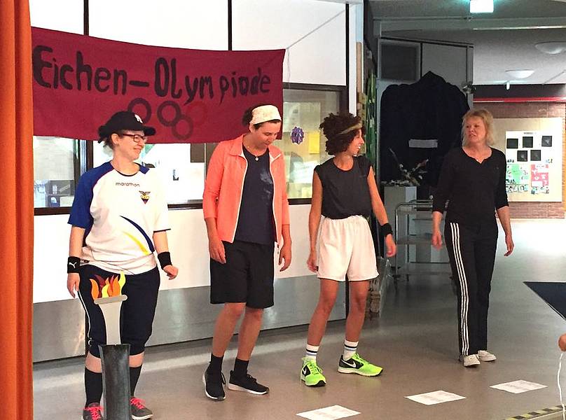 Am Montag wurden zunächst die Sportler vorgestellt. Der absolute Favorit für die Goldmedaille war Hansi Hechtsprung. Nach dem Einlauf in die Arena wurde das Banner der Eichen-Olympiade aufgehängt und das Olympische Feuer positioniert. Beides hat uns die Woche über begleitet. Dann gab es schon die erste Disziplin. Hansi Hechtsprung war sich sicher, dass seine Gegner im Wettlauf keine Chance gegen ihn haben werde. Leider hat Hansi sich überschätzt und ist als Letzter im Ziel angekommen.