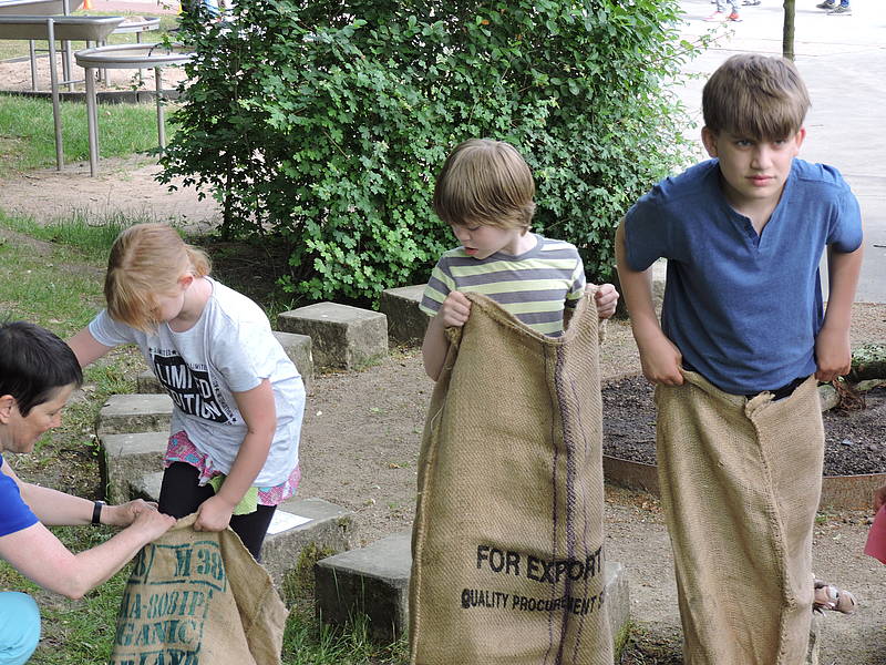 Am Mittwoch haben sich die Sportler im Sackhüpfen gemessen. Auch hier haben sie wieder Unterstützung durch die Schülerinnen und Schüler der Abschlussstufe erhalten. Danach sind alle Schülerinnen und Schüler wieder in ihre Projektgruppen gegangen.