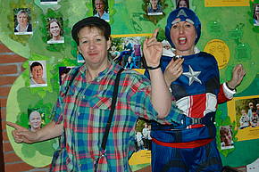 Nach der Pause gab es unsere traditionelle Rosenmontagsfeier, mit Schokokuss-Wurfmaschine, Popcorn, kleinen Hot-Dogs und natürlich viel Musik zum Tanzen! Beim Kostümwettbewerb hat die Jury diesmal besonders darauf geachtet, dass die Preise an Schüler gehen, die sich an unser Rosenmontag-Motto - in diesem Jahr "Helden und Schurken" - gehalten haben: der erste Preis ging an Tim, der zweite an Pascal und der dritte an Sandra.
