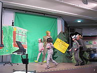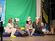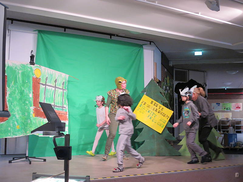 Im Gegensatz zum letzten Theaterstück mussten die Schüler richtig viel Text lernen und sich vor allem merken, wann sie mit sprechen dran waren! Lian war unsere Erzählerin – dafür hat sie mit einer adaptierten Maus den Computer bedient: bei jedem Klick auf den Taster ging der vorher aufgenommene Text ein kleines bisschen weiter. Frau Dierck hat ihr dabei geholfen.