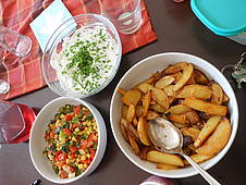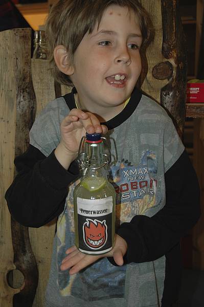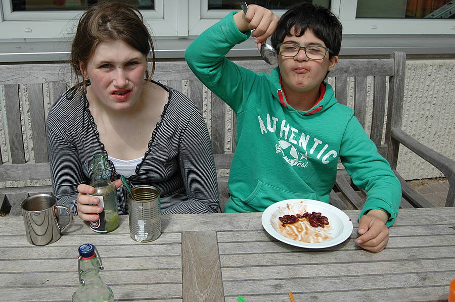 Dienstag gab es Bohnen mit Speck. Dafür braucht man vor allem Bohnen aus der Dose, Zwiebeln und Speck. Beim Zwiebelschneiden tränten so manchem unserer Cowboys die Augen, aber das Essen hat ziemlich lecker geschmeckt. Dazu gab es selbstgebackenes Brot und „Feuerwasser“, eine besondere Limonade aus Limettensaft, Ingwer, Wasser und Zucker. Obwohl wir eigentlich nur eine „Probierportion“ geplant hatten, waren nachher alle ziemlich satt...