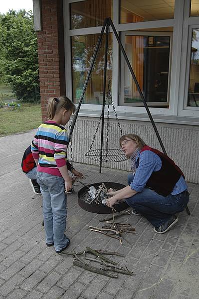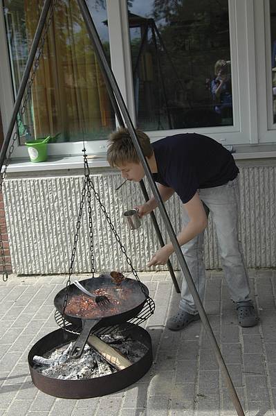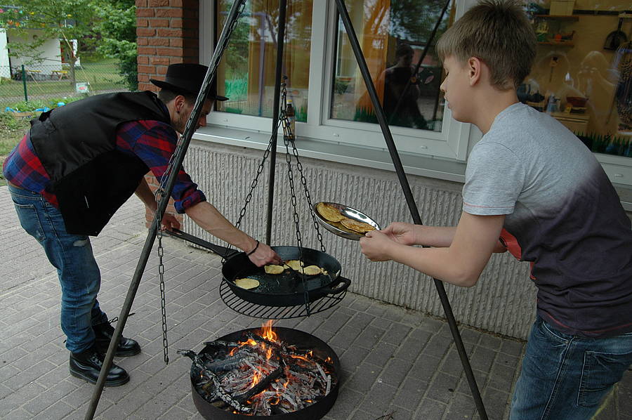 In der Saloon-Gruppe haben wir gekocht wie im Wilden Westen. Der wichtigste Unterschied zu heute: wenn Cowboys und Indianer durch die Prärie zogen, hatten sie keinen Herd oder Backofen dabei. Also mussten wir morgens immer zuerst das Lagerfeuer anzünden und ein Dreibein darüber stellen, auf dem wir unsere Pfanne befestigen konnten.