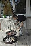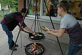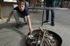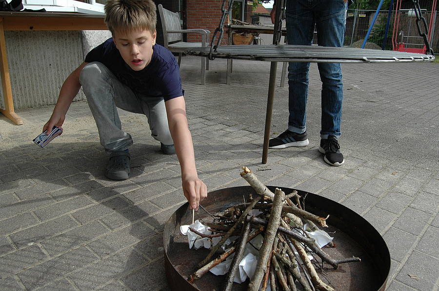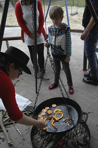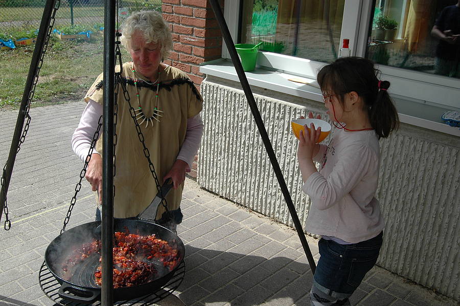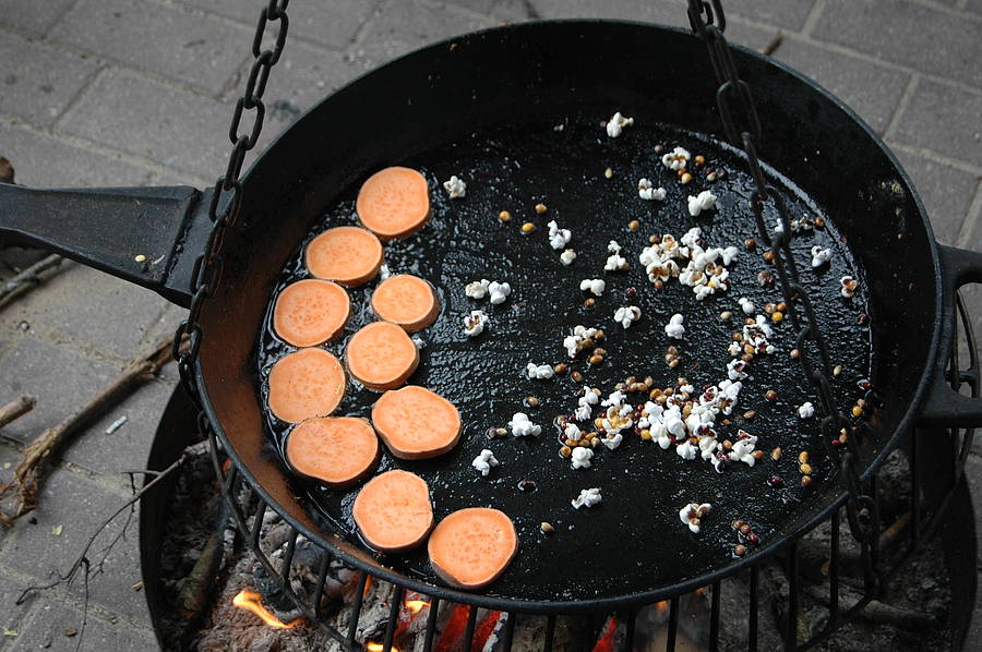 Mittwoch haben wir dann gekocht wie die Indianer. Da wir nicht auf Büffeljagd gehen konnten, haben wir überlegt, was Indianer gegessen haben, wenn gerade keine Büffel in der Nähe waren. Bei uns gab es Maisfladen, die wieder über dem offenen Feuer gebacken wurden. Außerdem haben wir Süßkartoffeln und Kürbis gebraten und auch ein paar Maiskörner in die Pfanne geworfen, die zu Popcorn wurden.
