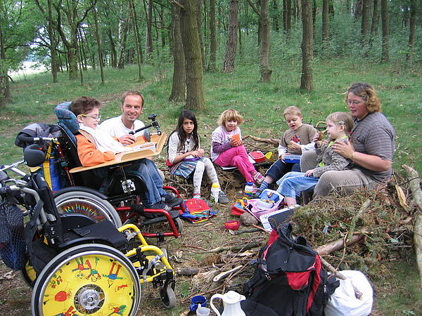 Über die „Waldtreppe“ – da werden Adem, Sebastian und Tobias in ihren Rollstühlen immer ziemlich durchgeschüttelt, kommen wir dann irgendwann zu unserem Waldsofa. Das ist so gemütlich! Da macht das Frühstücken richtig Spaß! Schaut her: