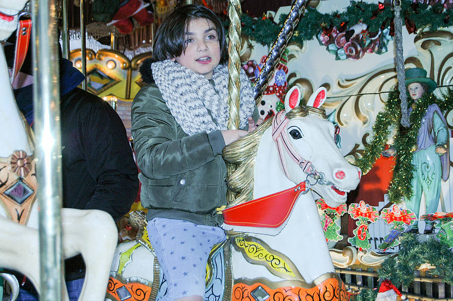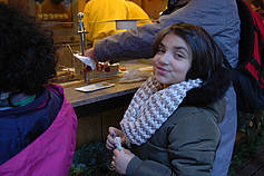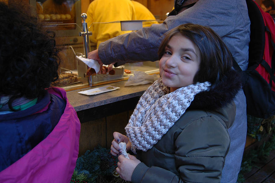 Dann sind wir rausgegangen aus der Kirche und haben auf dem Weihnachtsmarkt was gegessen. Wir durften es uns selber aussuchen. Danach haben wir Kinderpunsch oder Kakao getrunken. Dann durften wir Karussel fahren. Sayina und ich waren im kleinen Riesenrad, Emine war in einem Karussel mit Pferden und Kutschen. Dann sind wir zurück zum Bahnhof gegangen und haben dort noch Poffertjes gekauft.