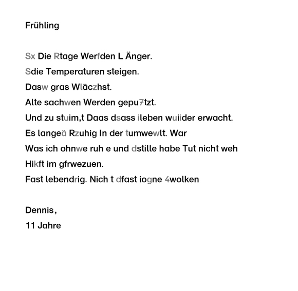 Dennis ist 11 Jahre alt und lebt mit Autismus. Lautsprache kann er kaum für sich nutzen. Den folgenden Text hat er, von einem Stützer am Unterarm gestützt, auf dem Laptop "geschrieben":