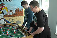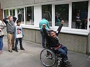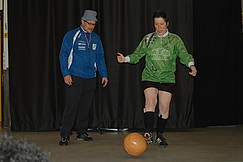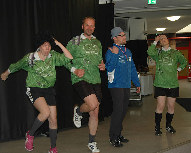 Am Mittwoch, dem 18. Mai, begannen wir die Woche mit unserem täglichen Theaterspiel am Morgen. Der Trainer (Jan-Christoph Ruddat) pfiff seine Mannschaft zusammen, die aus dem übereifrigen Ronny (Friederike Heese), dem Schönling Harry (Henrike Twer), dem Tollpatsch Paul (Andreas Stiller) und dem überaus sportlichen Rudi (Katharina Koch) bestand. Hochmotiviert mussten sich alle erstmal auf einen Ball einigen, den man zum Fußballspielen gebrauchen kann. Statt Gymnastikball, Kugelstoßkugel, Wasserspielball und Medizinball, fanden sie Dank der Hilfe unserer Schülerschaft endlich einen richtigen Fußball.