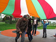 Jetzt konnte es losgehen mit der Projektwoche. Gemeinsam stimmten alle das Lied „Jetzt geht es los!“ an, was im Laufe der Woche zum fröhlichen Morgenritual wurde. Nachdem alle Schülerinnen und Schüler in ihre Projektgruppen aufgeteilt wurden, konnten sie im 2. Block ein vielfältiges Angebot an verschiedenen Spielen mit Bällen draußen auf dem Schulhof und drinnen im Schulgebäude finden. Da gab es Ballspiele mit Schwungtuch, Basketball, Fußball, Seifenblasen, ein Wissensquiz, ein Geräusche - Such - Spiel, Kegeln, Dosenwerfen, Tischtennis und Krökeln. Es hat allen richtig viel Spaß gemacht.