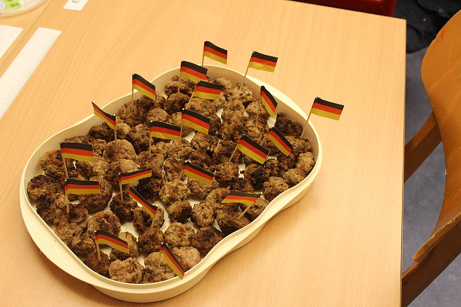 Am Montag, den 23. Mai, erlag der tollpatschige Paul in dem Theaterstück einen Schwächeanfall und musste erstmal etwas essen. Seine Motivation weiterzumachen erhielt er dann von seinem Trainer, der die Liste der Köstlichkeiten für das für den nächsten Tag anstehende Fußballturnier vorlas. Die Schülerinnen und Schüler gingen danach in ihre Klassen, um diese selber herzustellen.