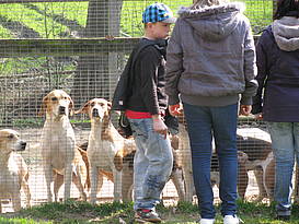 Nach dem Mittagessen geht es mit dem Bus und Frau Twers Auto nach Dorfmark. Die Sonne scheint und wir laufen durch den schönen Bürgerpark, essen Eis und besuchen dann den Hof von Familie von Schultzendorf. Hier lebt die „Niedersachsenmeute“, das sind ca. 40 Foxhounds. Außerdem gibt es viele Pferde auf dem Hof und einige Reiter, die sich freuen Simon mal wieder zu sehen. Simons Schwester hat nämlich mehrere Jahre auf dem Hof mit den Pferden und Hunden gearbeitet und Simon hat ihr oft geholfen. Die beiden Seniorenhunde Kati und Diva begleiten uns auf dem Hof und werden immer gekuschelt und gestreichelt. Patrick war sogar als „Frischfleischangebot“ im Hundezwinger- die Hunde waren aber satt und haben ihn nur angesprungen. Die Meute wird jeden Tag trainiert, an einem Tag sind die Hündinnen dran, am nächsten Tag die Hunde. Das Training findet direkt am Truppenübungsplatz statt und wir mussten zum Zuschauen eine Sondergenehmigung des Militärs im Auto haben. Auf dem Weg zum Training laufen die Hunde auf der Straße zwischen den Reitern, die jungen oder wilderen Hunde werden dabei an einen ruhigeren Partner gekoppelt. Das Zusehen beim Training hat dann richtig Spaß gemacht. Nach dem Abendessen fahren wir dann noch mit den Rädern zu Frau Winterfeld und holen die wirklich leckeren Apfelchips ab.