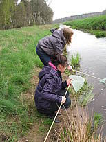 Nach dem Frühstück fahren wir mit unseren Rädern zum Mühlen-graben. Wir haben Käscher dabei und fangen gleich zwei Stichlinge, eine Schnecke und einen Wasserläufer. Jakob findet das total spannend und ist dabei ins Wasser gesprungen. Er war so flink, dass ihn niemand mehr festhalten konnte. Zum Glück ist es zum Jugend-heim nicht weit und Christian holt ihm schnell trockene Sachen. Frau Pries und Frau Twer helfen Jakob aus seinen nassen Sachen heraus und geben ihm etwas zum Überziehen. Das nasse Zeug hängt über einem Zaun, das sieht lustig aus. Aus Stöcken, Bindfäden und Büroklammern bauen wir uns Angeln, mit Rindenstücken als Pose (Simons Idee). Leider hat aber kein Fisch angebissen. Nachmittags fahren Siana, Jakob, Christian, Gaby und Jana mit der