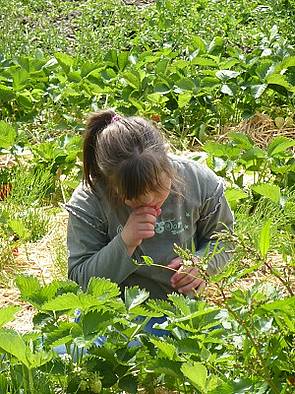 Wie das mit dem Erdbeerpflücken nun genau funktioniert, wollten die Igelkinder sich selbst anschauen und so ging es auf zum Erdbeerfeld. Nachdem zunächst unsere leeren Körbe gewogen wurden, damit wir ihr Gewicht später nicht mit bezahlen müssen, sprangen wir aus dem Bus und es ging schnurstracks ins Feld. Und dann wurde gepflückt, was uns vor die Hände kam. Besonders wichtig ist es beim Pflücken, darauf zu achten, dass die Erdbeeren rundherum rot sind und keine weißen Stellen mehr haben.