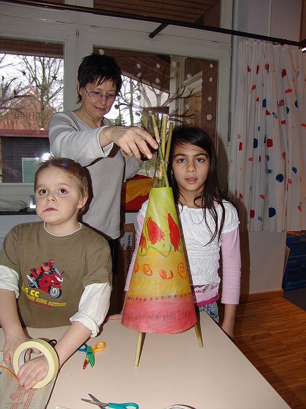 - Tobias, Jutta und Sunita mit einem Tipi als Laterne