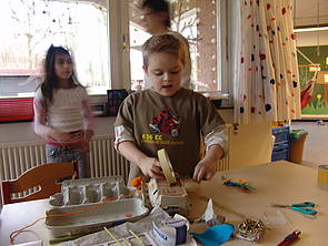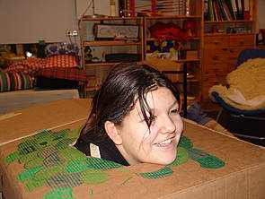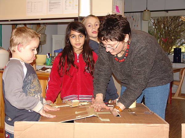 Eine Bastel-AG mit Material, was fast nichts kostet. Das wäre Klasse! Und schon war die Idee geboren: die Müll-AG!!! Mit Müll wurden wir nun von allen versorgt, z.B. Tomatendosen von Herrn Stiller, die Stuhlkartons von der Abschlussstufe. Hauptverbrauchsmaterial Kreppklebeband mussten wir dazu kaufen. Mit Kreppklebeband können auch die jüngeren Schüler verschiedene Schachteln, Deckel, Dosen etc. zu Fantasiegebilden zusammen fügen. So entstanden „Monster“, „Autos“, „Boote“ und eine „Lichterburg“. Aus großen Kartons wurden Fernseher mit wechselndem Programm. Und fast alle bauten sich ein eigenes Haus mit Fenster und Tür. Ein großer Spaß für Marcel, Sunita und Tobias! Vicky hatte mehr Spaß beim Bau eines Tipis als Laterne aus Bambusstöcken und geöltem Papier, eines Regenmachers aus einer Pappröhre, Zahnstocher und Geschenkpapier und einer Tontopftrommel aus Tontopf bespannt mit mehreren Lagen Butterbrotpapier. Es hat uns allen viel Spaß gemacht. Besonders begeistert waren wir von den selbstständigen Bastelaktionen der Schüler. Hier waren wir nur helfende Hand im Hintergrund. Es wird sicher eine Fortsetzung geben!