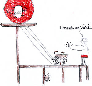 Irgendwann war die Batterie in der Zeitmaschine leer, da sind die beiden zu Leonardo da Vinci in Florenz in Italien gegangen. Alle zusammen haben ein Holzgestell gebaut, wo man treten musste, wie auf einem Fahrrad. So sind sie in die Jetztzeit zurückgekommen.