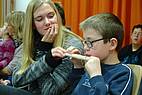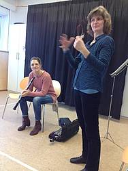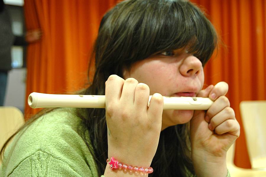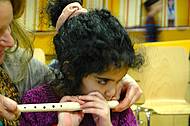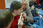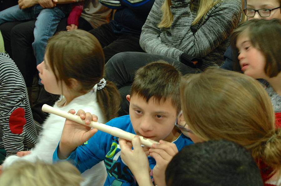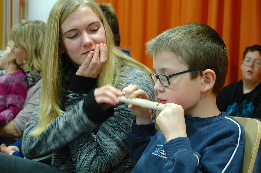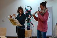 Dabei erzählten sie uns viel über Klangfarbe und Tonumfang, aber auch über die Mundstücke für die Oboe, die Frau Ingwersen immer zu Hause selber bauen muss. Zum Ausprobieren hatten die beiden Musikerinnen eine Kunststoffquerflöte dabei. Leider blieb viel zu wenig Zeit, als dass alle Kinder die Flöte hätten ausprobieren können!