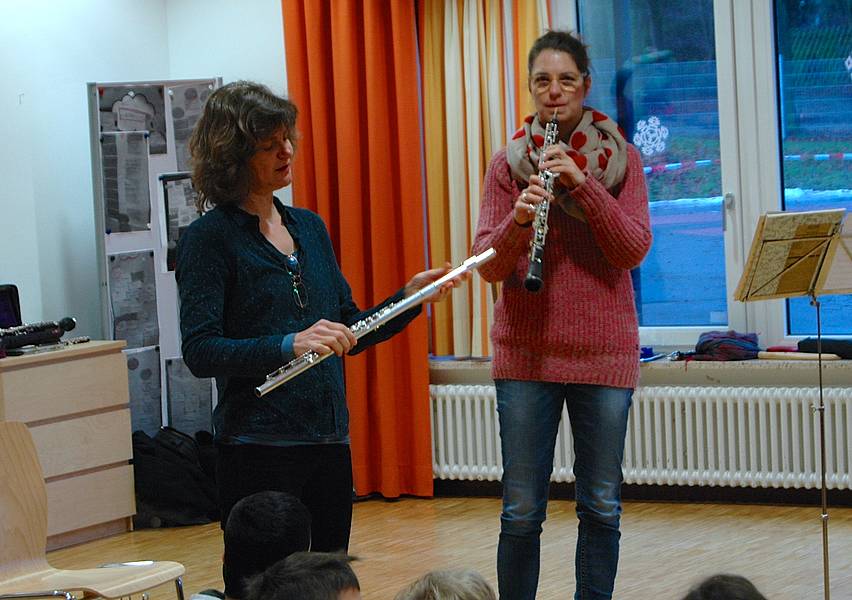 Am Montag, den 11. Januar 2016 hatten wir in unserer Schule erneut Besuch von zwei Musikern der NDR Radiophilharmonie. Nachdem uns im letzten Frühjahr zwei Blechbläser ihre Instrumente vorgestellt haben, kamen in diesem Jahr mit der Oboe und der Querflöte die Holzbläser an die Reihe. Heike Malz und Kerstin Ingwersen spielten verschiedene Stücke auf ihren Instrumenten und auch auf deren „Verwandten“, der Piccoloflöte und dem Englischhorn.