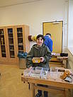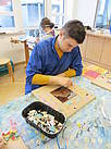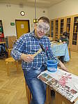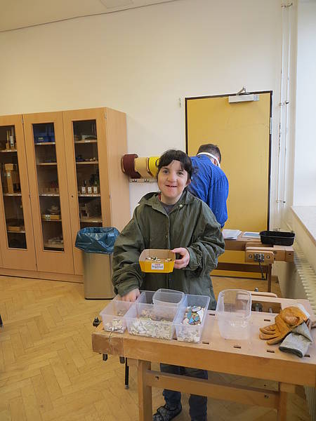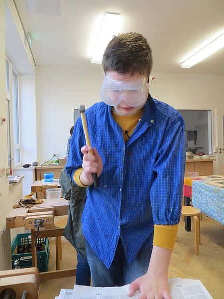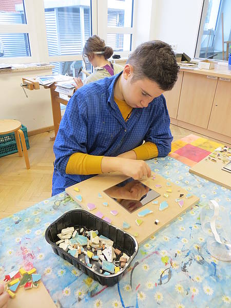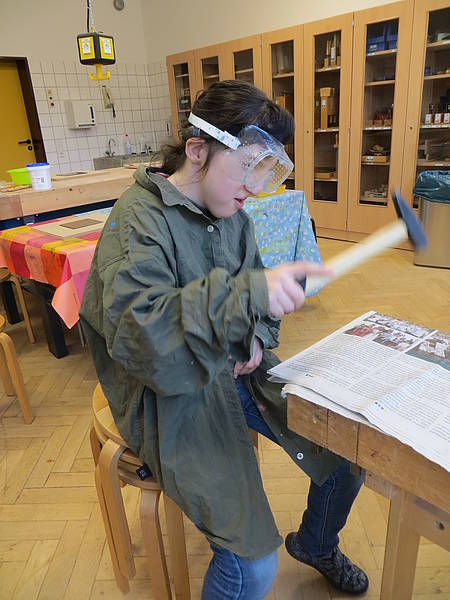 Aus einem großen Fundus bunter Fliesen suchten sich die Schüler ihre Lieblingsfarben heraus. Bewaffnet mit Hammer und Schutzbrille wurden die Fliesen dann im Werkraum, mit viel Spaß, zerkleinert.