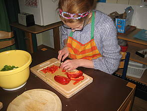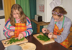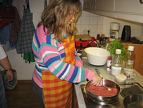 Sarah brät das Hackfleisch an. Wenn das Fleisch braun wird, kann man die Zwiebeln dazugeben. Während Sarah brät, schneidet Marie die Paprika in kleine Stücke.