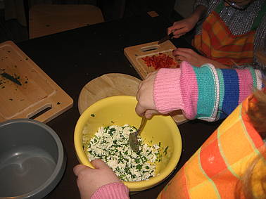 Hier seht ihr wie Onur, Sarah, Marie und Steve die Käsefüllung zubereiten.
