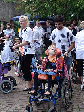 Unsere Rollstuhltanzgruppe bestand aus 20 Teilnehmern, Rollstuhlfahrer und Schieber.