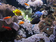 Im Sealife kann man ganz viele Fische anschauen. Die Korallenfische sind besonders schön, weil sie so bunt sind. Man kann auch Seepferdchen, grüne Meeresschildkröten, Schwarzschwanzflossenhaie und Quallen sehen. Besonders eindrücklich sind die Kuhnasenrochen. Sie leben in einem großen Wasserbecken und können schnell schwimmen. Ihr langer Schwanz ist wie eine Peitsche und auf dem Rücken haben sie einen Giftstachel, dem man nicht zu nahe kommen sollte. Wenn man seine Hand außen an die Scheibe des Beckens legt, kommen die Rochen ganz nah heran, weil sie unseren Herzschlag wahrnehmen können. Siana hat diesen Aquarium auch am besten gefallen, sie hat das Gesicht ganz nah an die Scheibe gehalten und den Fischen fasziniert zugeschaut.