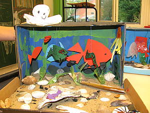 Schließlich sind wir zufrieden wieder zur Schule zurückgefahren. Die meisten Schüler hatten sich ein Band mit dem Foto einer Meeresschildkröte aufgesetzt, wie ihr es bei Jennyca und Patrick seht. In der folgenden Woche haben die Schüler und Schülerinnen in der Schule aus Schuhkartons tolle Aquarien gebaut. Auf dem Foto seht ihr das von Simon.