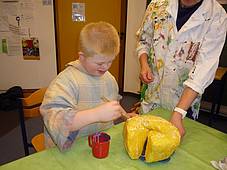 das „Räuberessen“ aus Pappmaschee gestalten sowie die Einladung malen und drucken.
