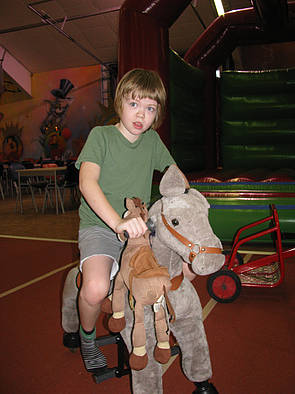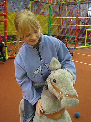 Joshi und Lea hatten besonders viel Freude an einem großen Stoffpferd. Da konnte man sich richtig drauf setzen. Lea hatte den Dreh raus, wie man sich mit dem Pferd fast reitend fortbewegen kann. Dazu musste man sich in den „Steigeisen“ hoch drücken und kurz zum Stehen kommen.