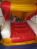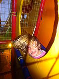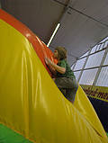 Felix ist über die steile Treppe in das Maul eines Hüpfkissentieres hineingeklettert. Das Maul schließt sich langsam und dann sitzt man wie in einer Höhle. Zum Glück kommt man am hinteren Ende über eine Rutsche gut wieder hinaus!
