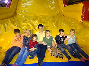 Joshi hat es als einziger geschafft, auf das große Hüpfkissen hinauf zu kommen. Es ist sehr steil und rutschig. Es gibt auch keine Griffe zum Festhalten.